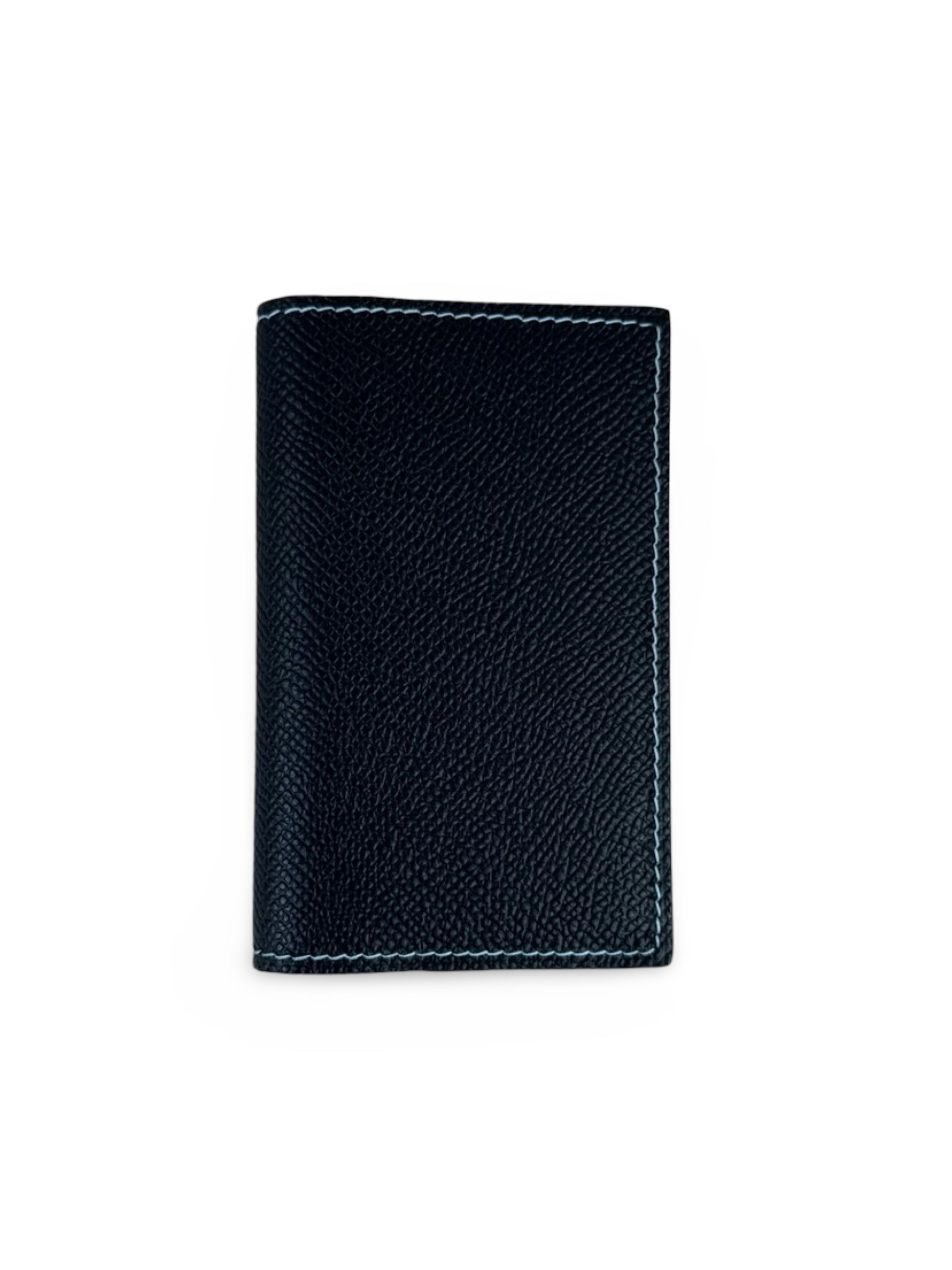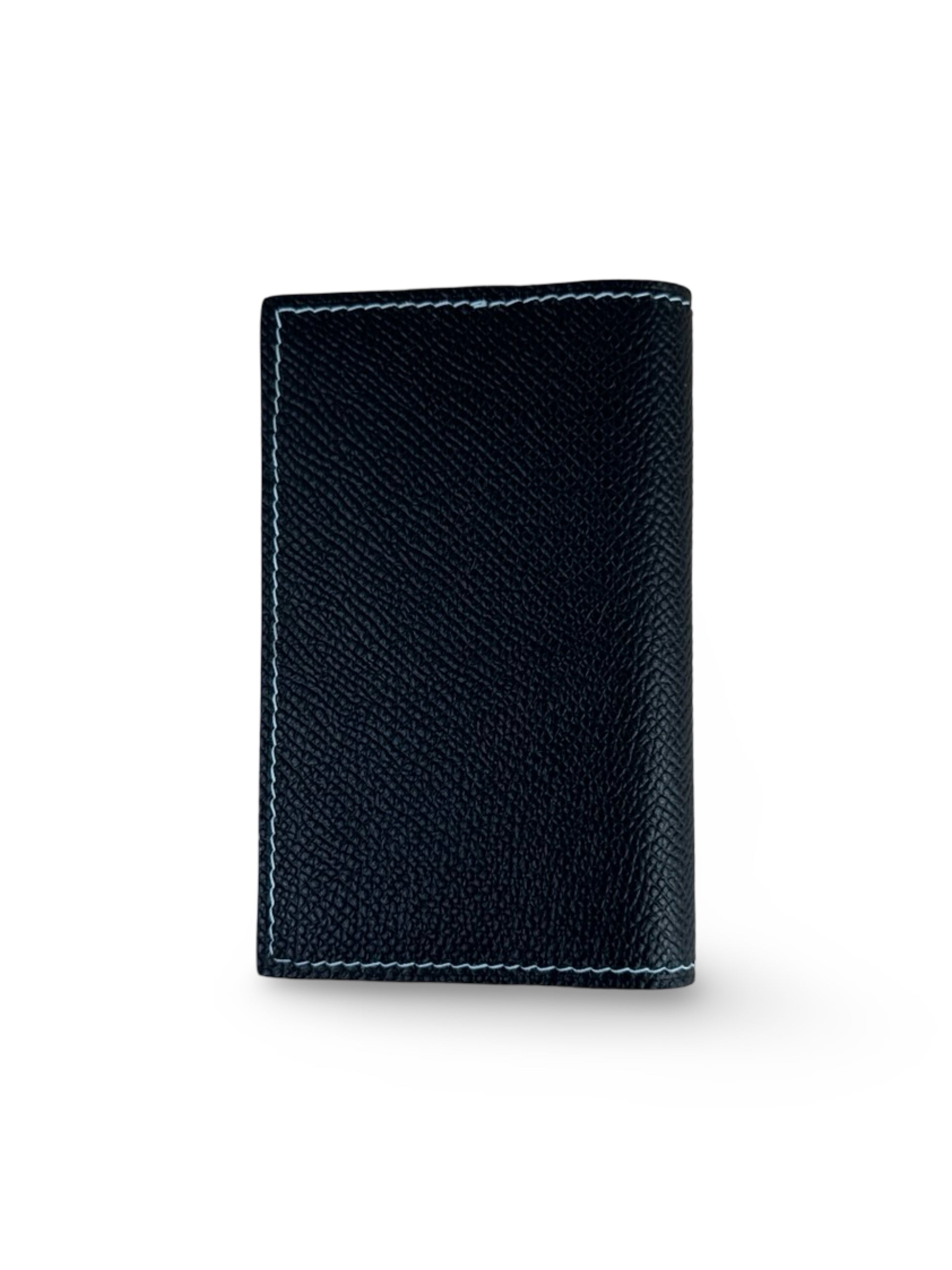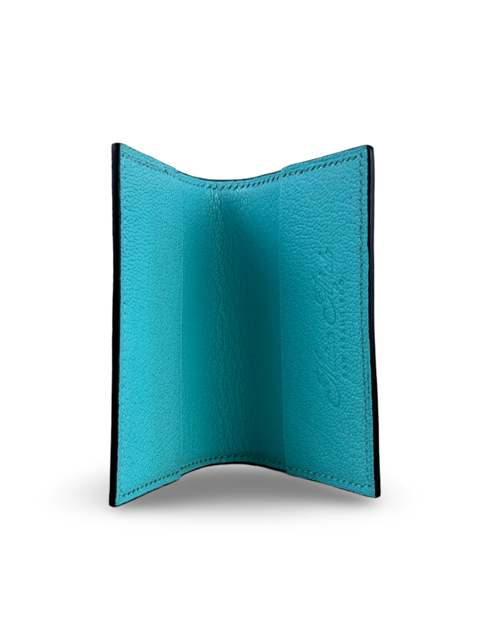The card holder is made of black Epson calfskin and Tiffany blue goatskin leather. It has 2 card slots, providing ample space for multiple cards or business cards. With its sleek and stylish design, this compact accessory offers both convenience and style on the go.