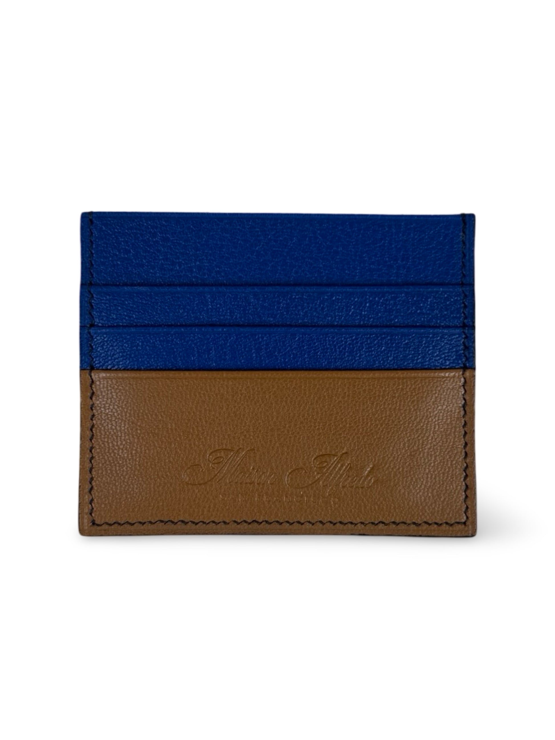 Dual color card holder with gold, electric blue French sully goatskin leather. It has 6 card slots and a center slip compartment, combining functionality with a sleek and stylish design.