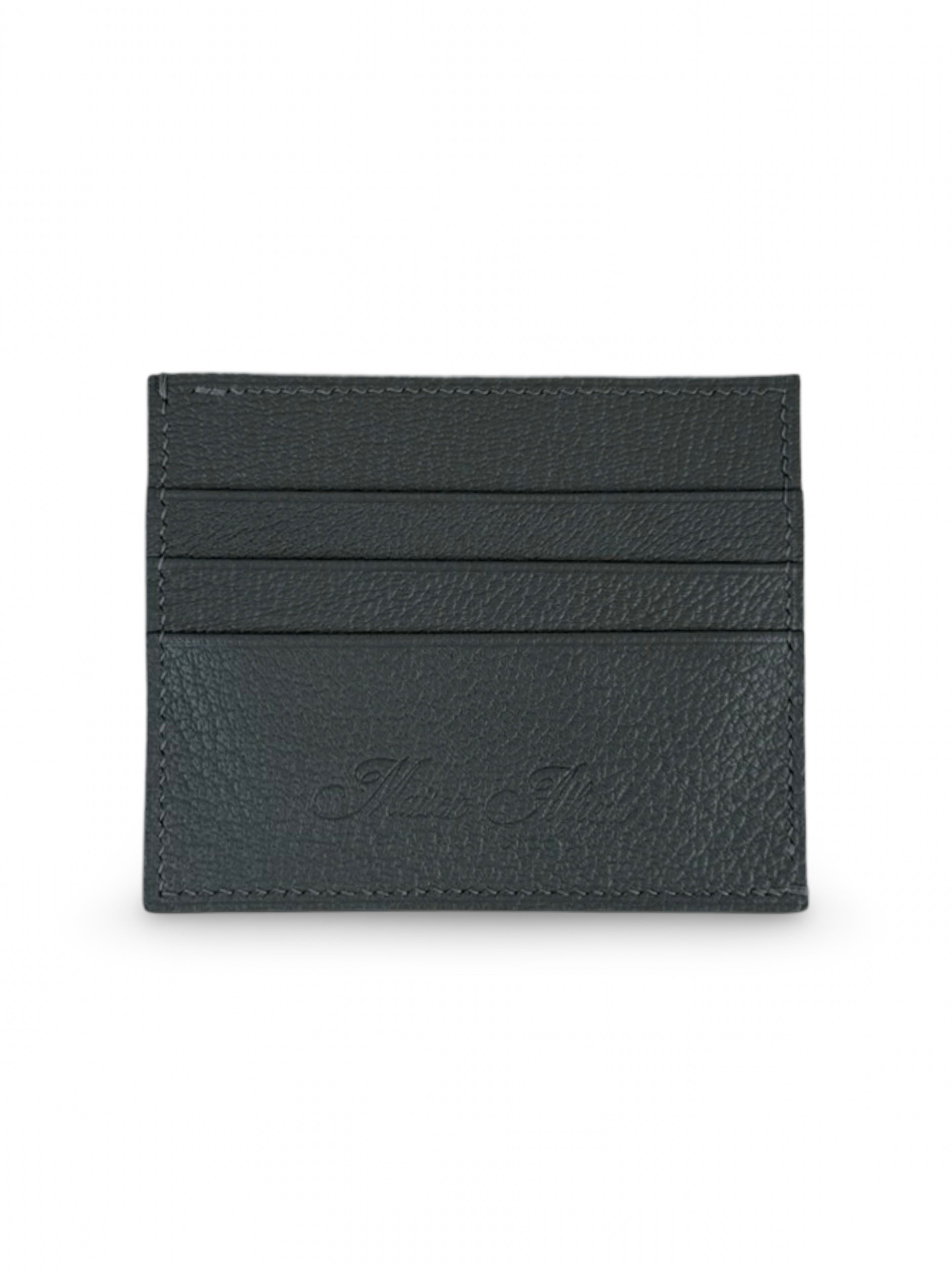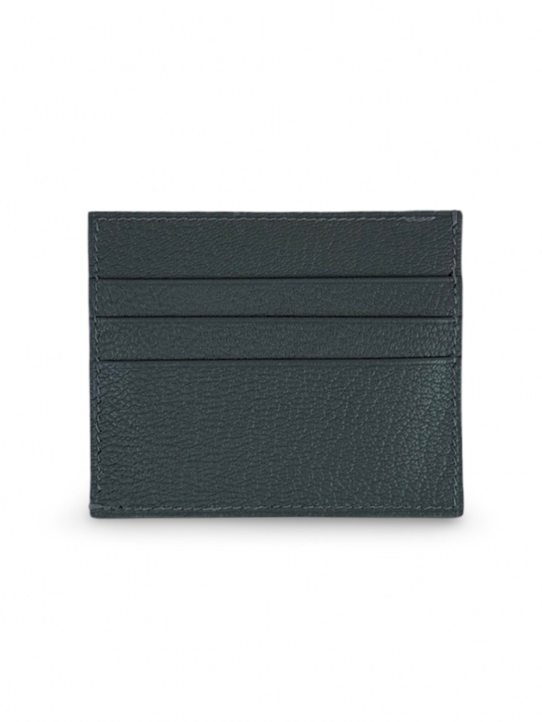Military green card holder is handcrafted from French sully goatskin leather that features a smooth, lightly pebbled texture, supple touch. It features 6 card slots and a center slip compartment.