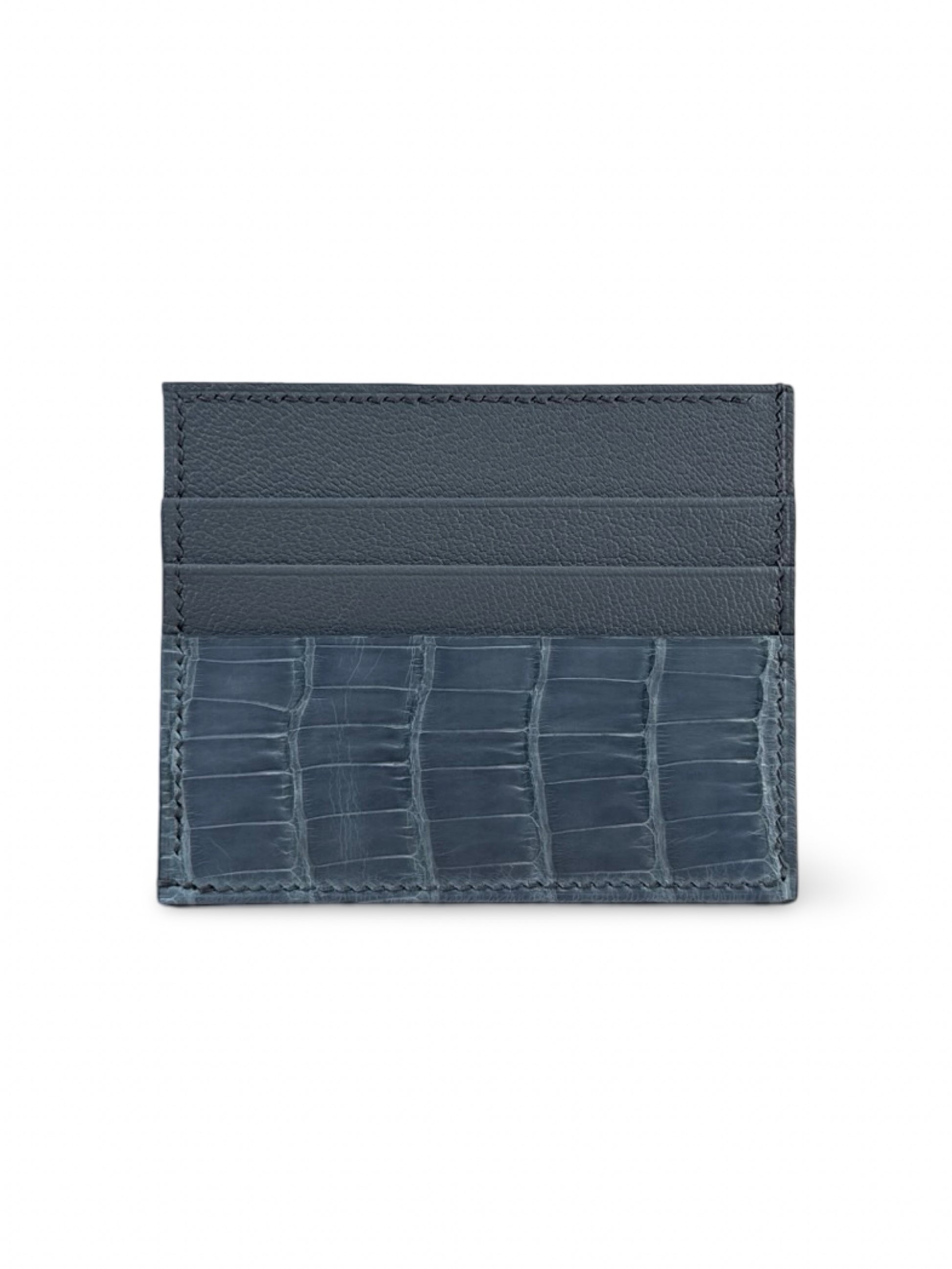 This open card holder is made with glazed silver sky alligator and French sully chèvre silver sky. It has 6 card slots and a center slip compartment, combining functionality with a sleek and stylish design.