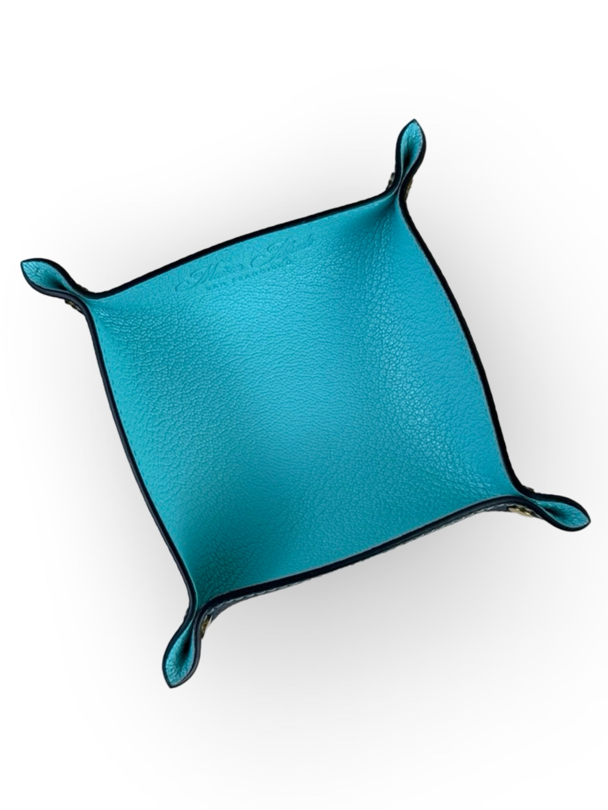 Valet tray is expertly crafted from luxurious French sully goatskin leather in a beautiful turquoise blue color and navy blue natural shrunken calfskin leather, complemented by stainless steel hardware. It makes for a perfect addition to your home decor.